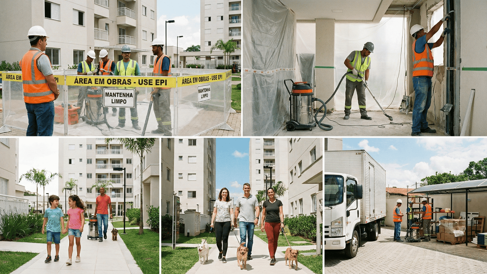 Ninguém gosta de conviver com entulho e poeira. Obras limpas são sinônimo de respeito ao morador. A equipe deve ter a rotina de recolher os resíduos periodicamente, varrer as áreas de circulação afetadas e cobrir materiais que possam gerar poeira com o vento. O fim do dia de trabalho deve marcar a entrega de um ambiente organizado, pronto para o trânsito seguro dos moradores, mitigando qualquer incômodo visual ou respiratório.